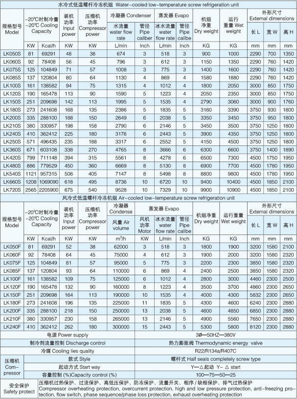 LK 系列低温螺杆冷冻机组是针对钢铁、医药、电子、化工、食品等特殊行业,根据多年工业用冷冻机组设计经验,综合国内外先进技术精心设计研发的低温冷冻设备,其温度范围可在 -30℃ -0℃之间任意调节,压缩机优选采用进口品牌的新型螺杆压缩机。系统零部件及电气控制元件均优选采用进口品牌,性能稳定可靠,控制系统采用 PLC 触摸屏控制,使操作更为简便。可根据客户需求订制各种使用工况的冷冻设备。