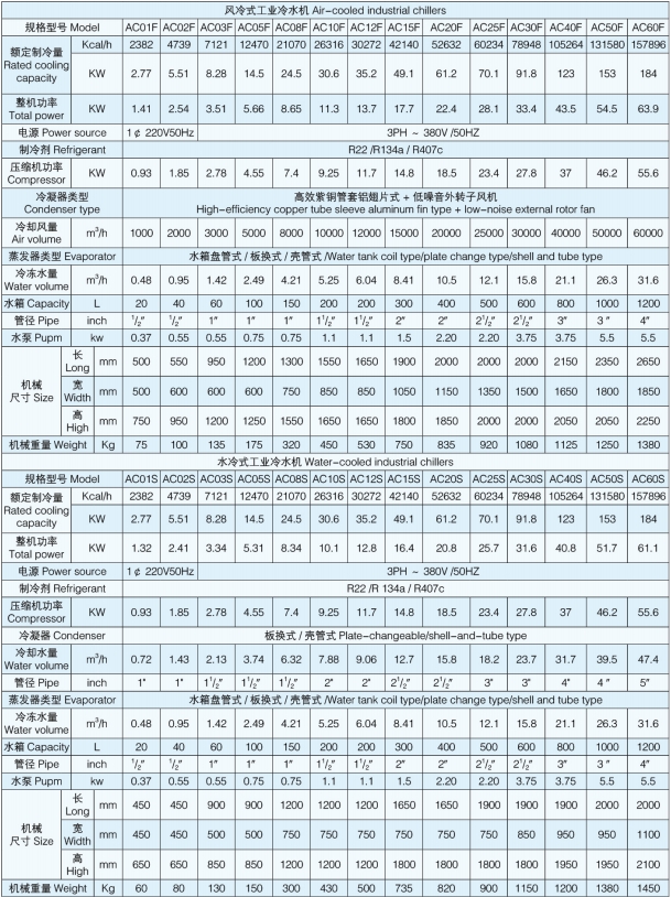 AC系列工业冷水机具有体积小、安装使用方便、在室内可任意移动等特点。压缩机、水泵、温控表、压力控制等优选使用全球知名品牌产品,可靠性高,噪声低。蒸发器采用纯钛金属或不锈钢材质制成,耐腐蚀、抗冻、这类机型被广泛地用于扫描电镜、原子吸收、ICP、激光器、真空镀模机、离子刻蚀机、氧氮分析仪、衍射仪、荧光光谱仪等科学仪器中,以及电子制造、焊接机器人、氦气压缩机、真空炉、反应釜、医药化工、食品饮料、 超声波、印刷医疗仪器、机床设备及液压系统等等各种工业冷却领域中。
