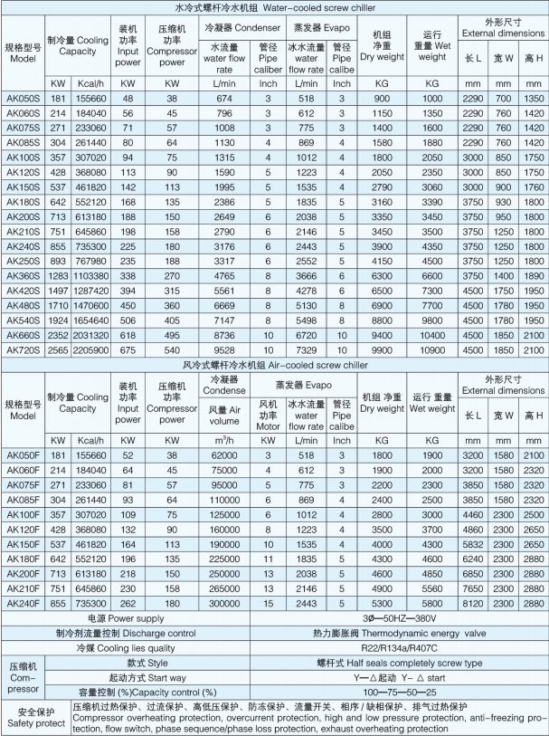 AK 系列螺杆冷水机组优选采用国际知名品牌螺杆压缩机,配套优质高效节能铜管制作冷凝器,蒸发器及世界名牌控制元件,使机组具备体积小、噪音低、能量大、寿命长、操作简便等优点,其优美精巧的外形设计和可靠稳定的高效能品质在同类产品中出类拔萃!
