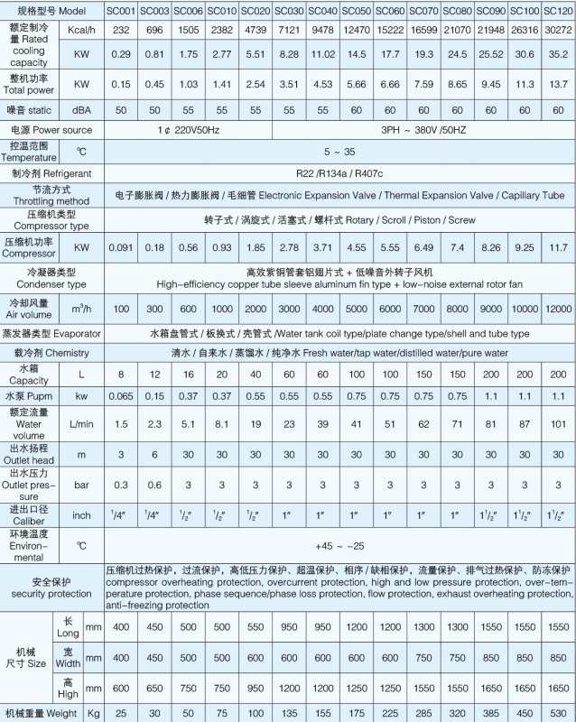 SC 系列小型冷水机具有体积小、安装使用方便、在室内可任意移动等特点,因压缩机、水泵、温控表、压力控制等使用的是优选进口产品,所以性能良好,噪声低。蒸发器一般采用不锈钢盘管制成,耐腐蚀、抗冻、这类机型被广泛地用于激光器、3D 打印机,真空镀模机、离子刻蚀机、氧氮分析仪、衍射仪、荧光光谱仪等分析仪器中,以及医疗仪器、机床设备及液压系统中。