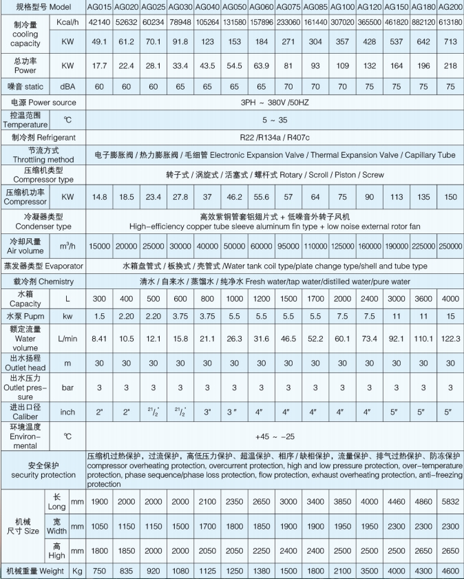 AG 系列大型工业冷水机组是针对部分或全部要求集中供冷冻水的工厂,生产线或设备,以及实验室等精准配套的制冷机组。压缩机,水泵,电器元件等优选采用进口产品,性能良好,噪音低,可靠性高,蒸发器采用 304 不锈钢盘管或 304 不锈钢板式换热器,也可选择紫铜管式壳管蒸发器,结实耐用,高效节能,换热效率高,适用生物化工、冶金冶炼、金属加工,金属表面处理,科学实验等领域,广受本公司用户好评!