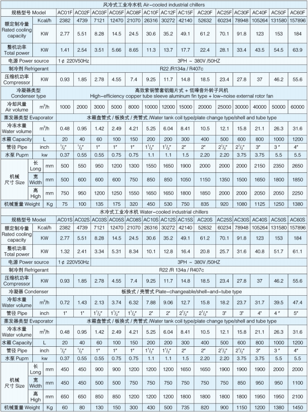 AC系列工业冷水机具有体积小、安装使用方便、在室内可任意移动等特点。压缩机、水泵、温控表、压力控制等优选使用全球知名品牌产品,可靠性高,噪声低。蒸发器采用纯钛金属或不锈钢材质制成,耐腐蚀、抗冻、这类机型被广泛地用于扫描电镜、原子吸收、ICP、激光器、真空镀模机、离子刻蚀机、氧氮分析仪、衍射仪、荧光光谱仪等科学仪器中,以及电子制造、焊接机器人、氦气压缩机、真空炉、反应釜、医药化工、食品饮料、 超声波、印刷医疗仪器、机床设备及液压系统等等各种工业冷却领域中。